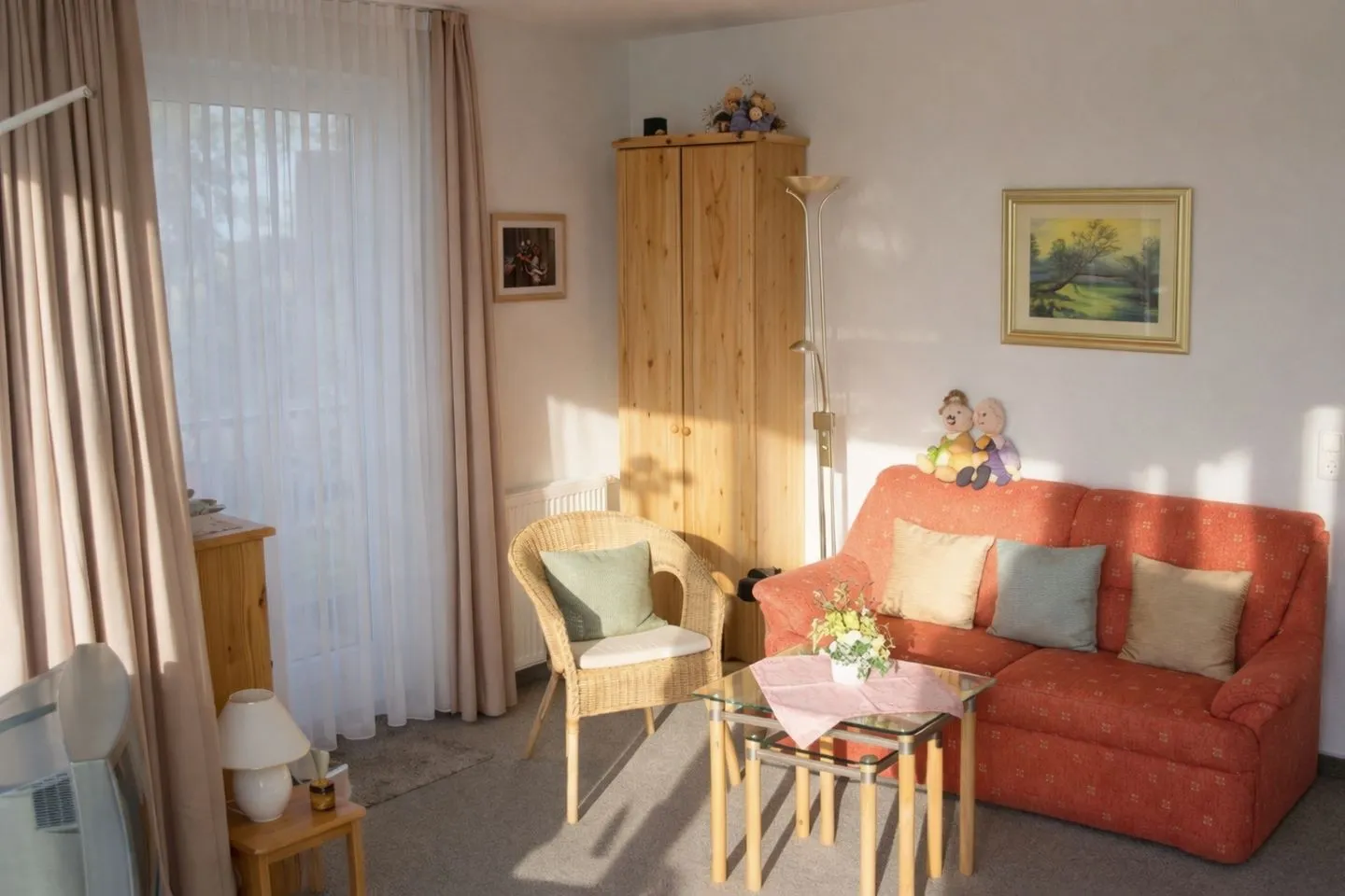 Der Wohnbereich ist mit Sofa und Esstisch ausgestattet und lädt zum Verweilen ein. Für Unterhaltung sorgen ein TV mit Satellitenanschluss sowie eine HiFi Anlage. WLAN ist selbstverständlich vorhanden. Sichtschutz an allen Fenstern sorgt für Privatsphäre. In Wohn und Schlafzimmer liegt Teppichboden.