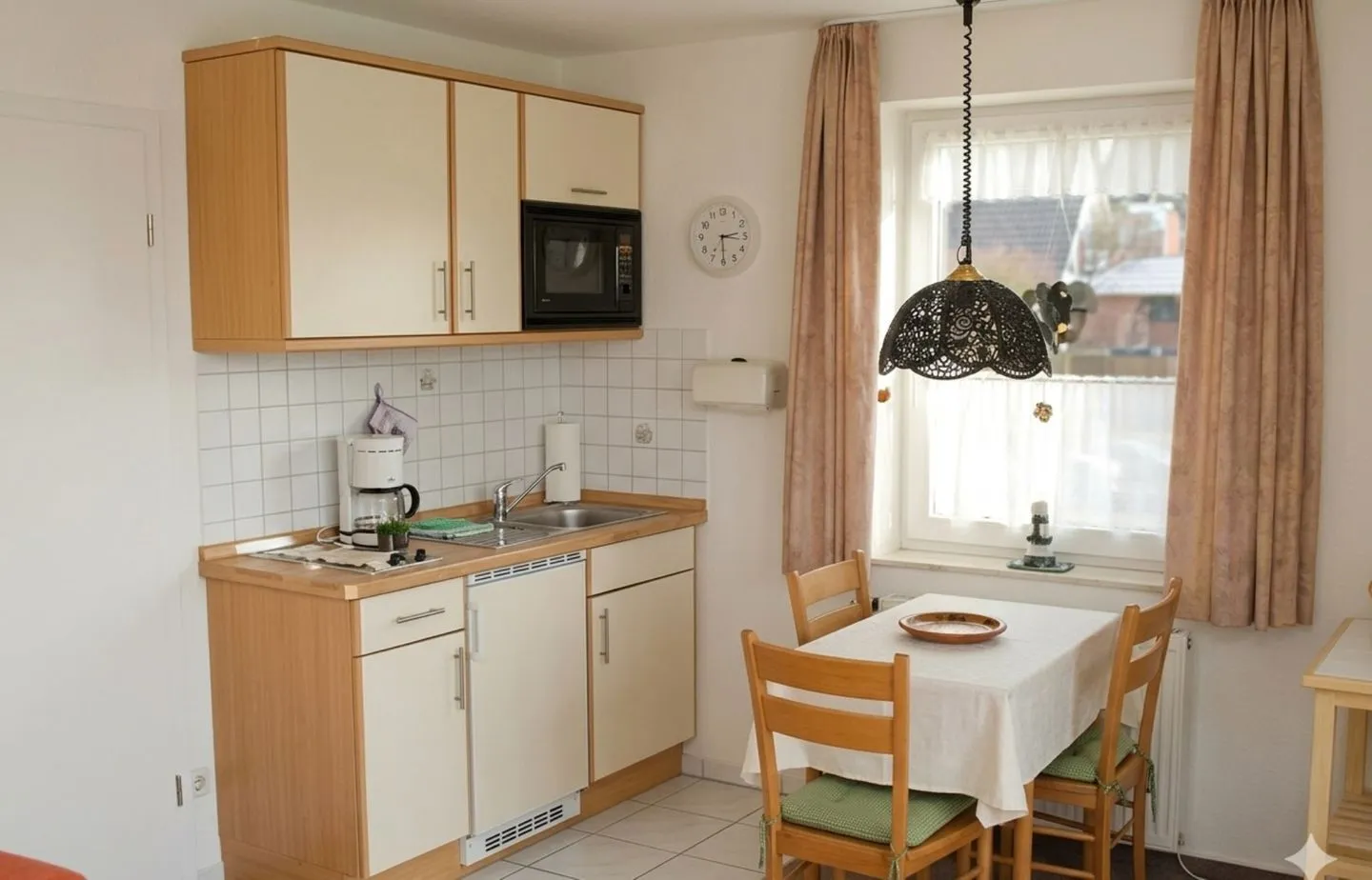 Die offen gestaltete Küche verfügt über ein 2 Platten Kochfeld, Mikrowelle, Kühlschrank mit Gefrierfach sowie Küchenutensilien, Geschirr und Besteck. Kaffeemaschine, Wasserkocher, Toaster und Eierkocher ermöglichen eine komfortable Selbstversorgung.